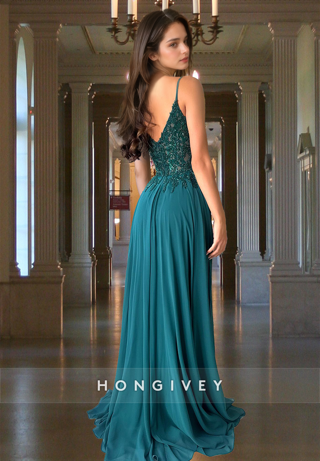 A-Line Spaghetti Straps Applique Dark Green Evening Dress Formal Gown