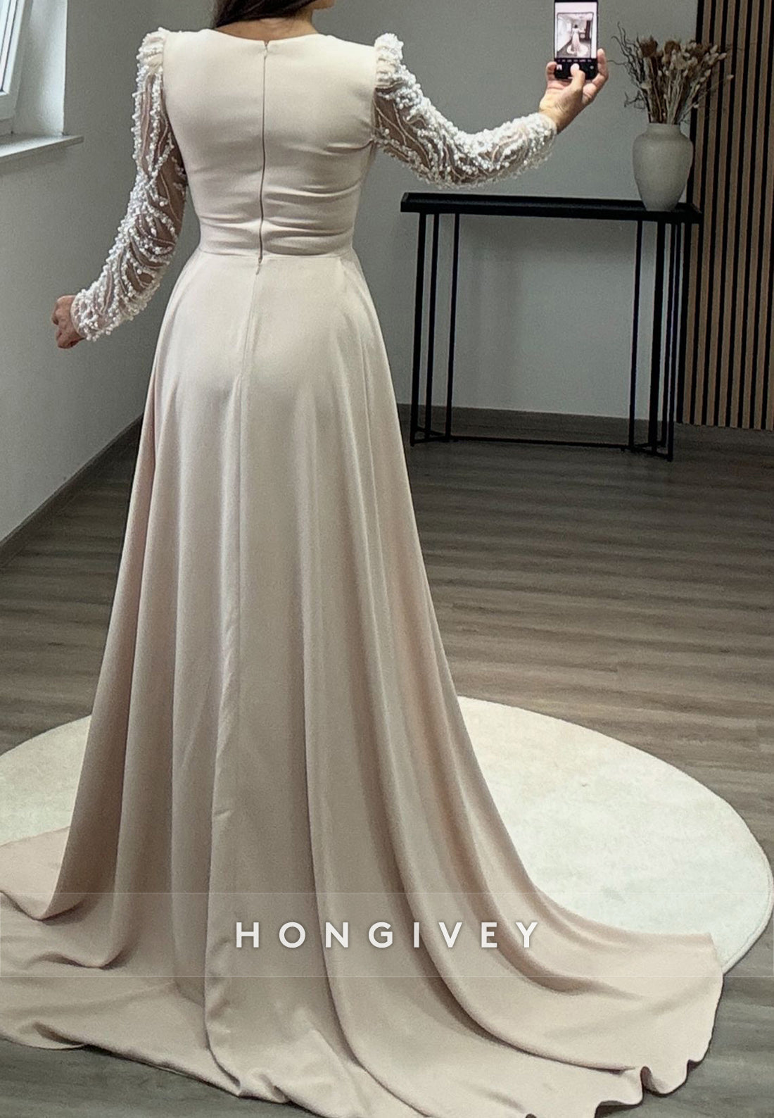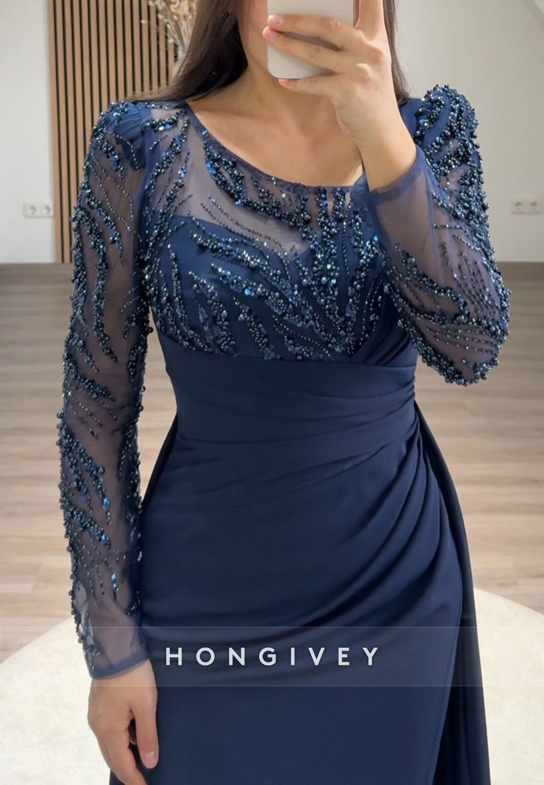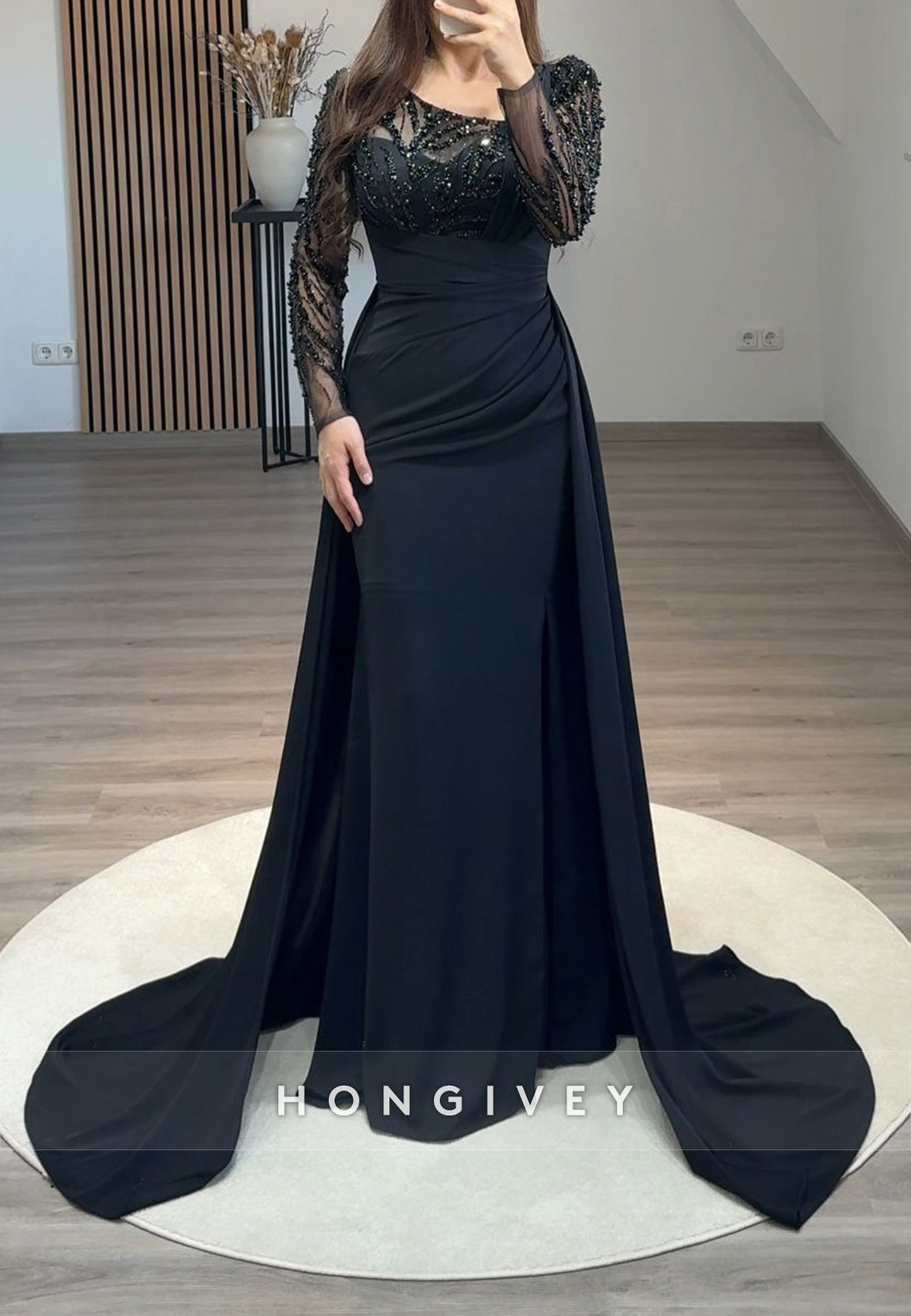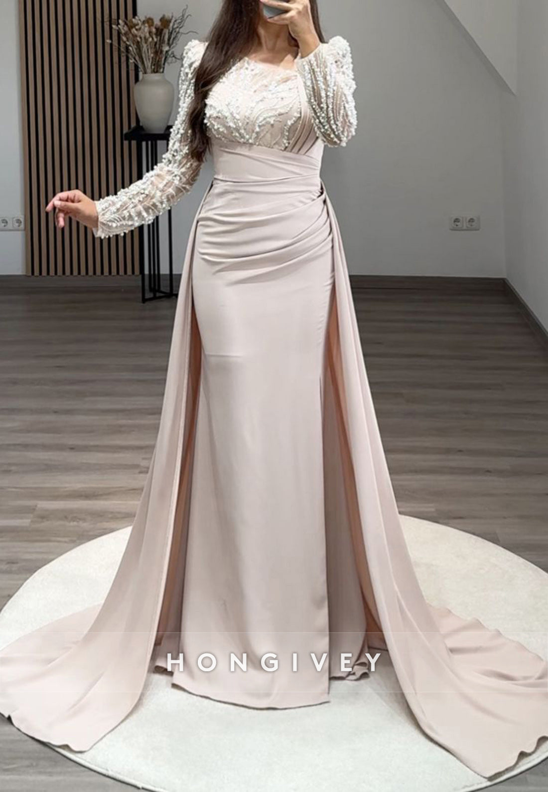 Pleated Beading Long Sleeve Illusion Neck Sweep Train Formal Dresses