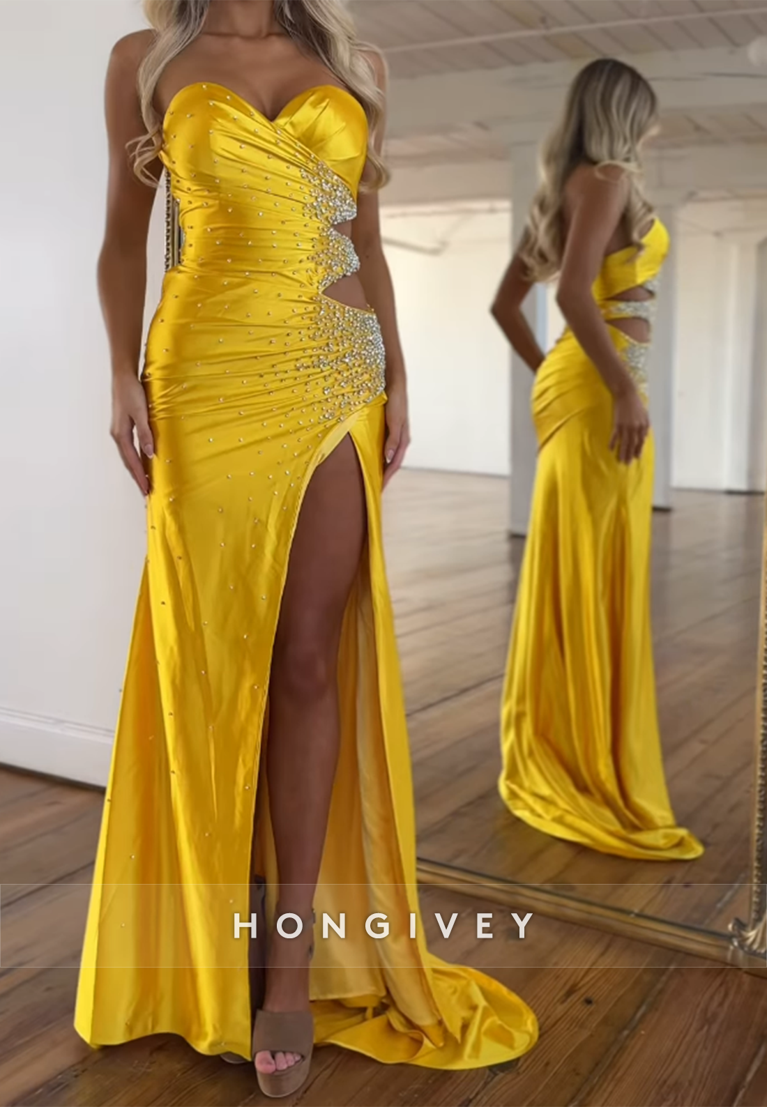 Sweetheart Rhinestone Pleats Formal Guest High Slit Prom Dresses