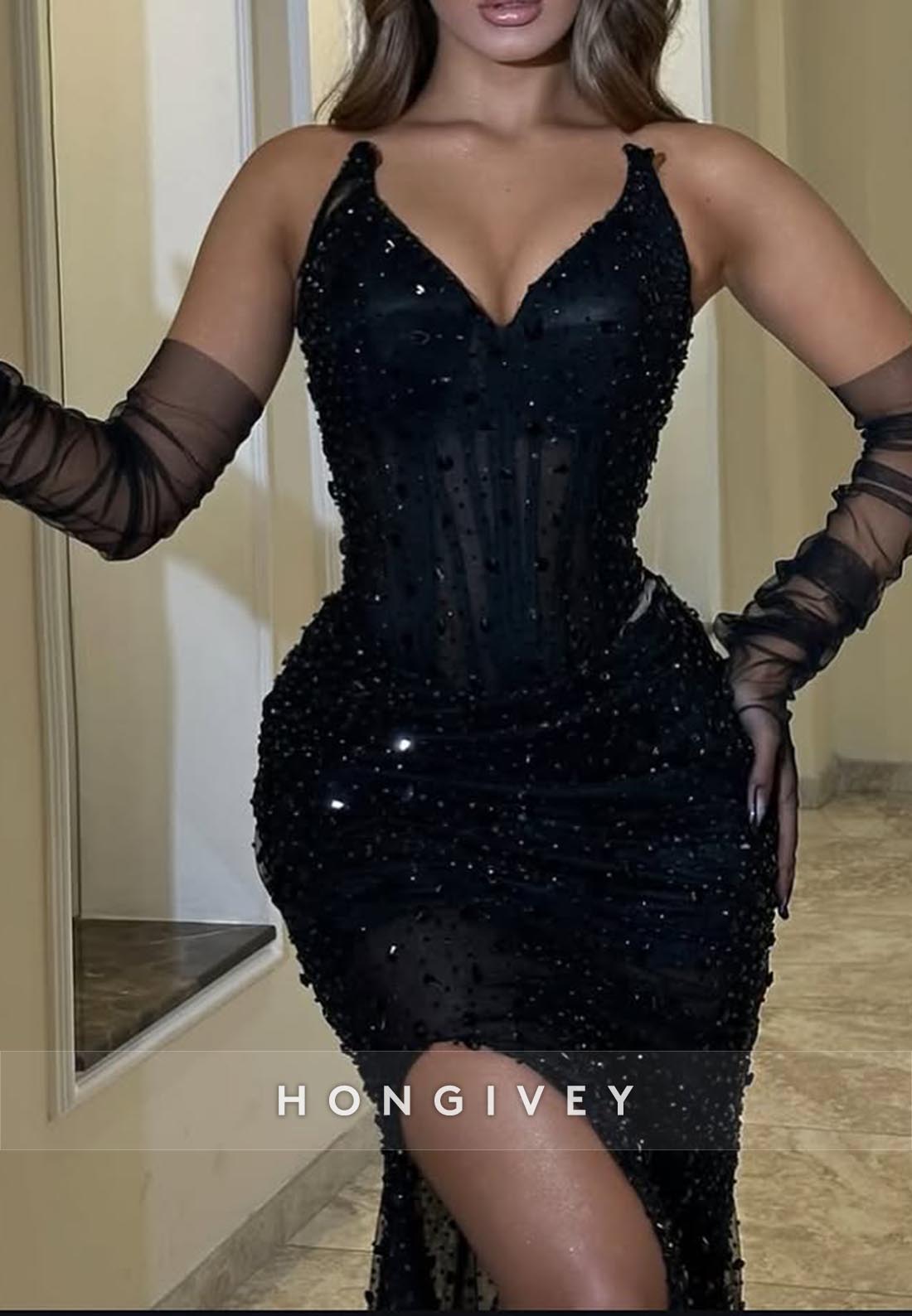 Sexy V Neck Bead Lace Side Slit Mermaid Black Formal Evening Dress