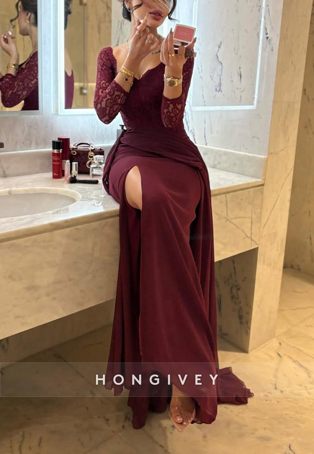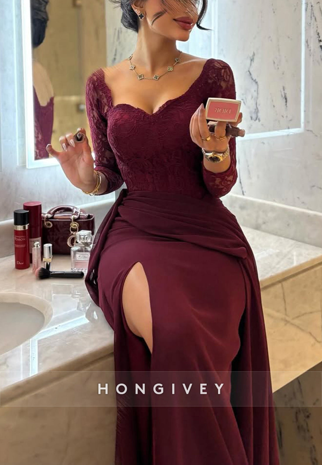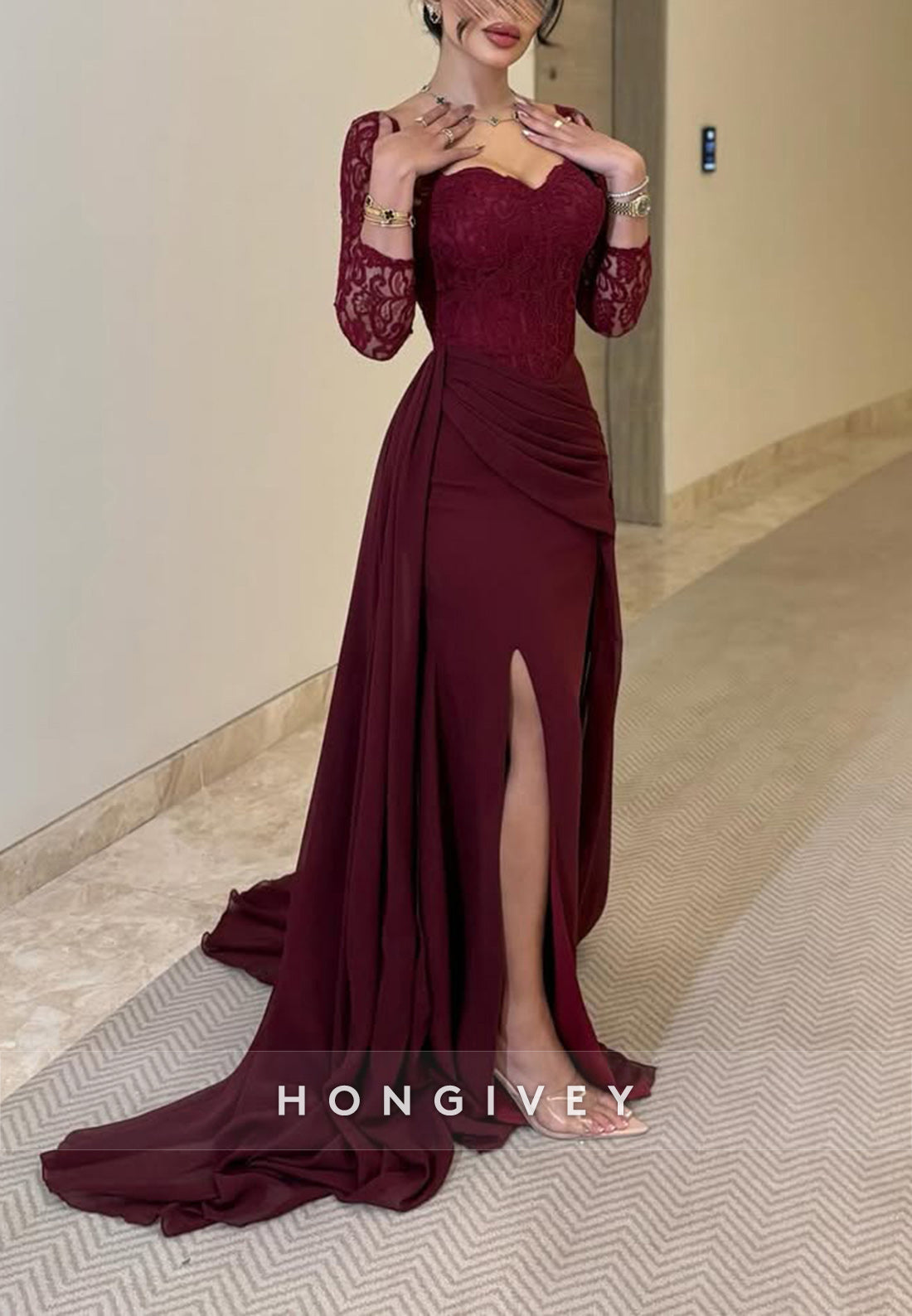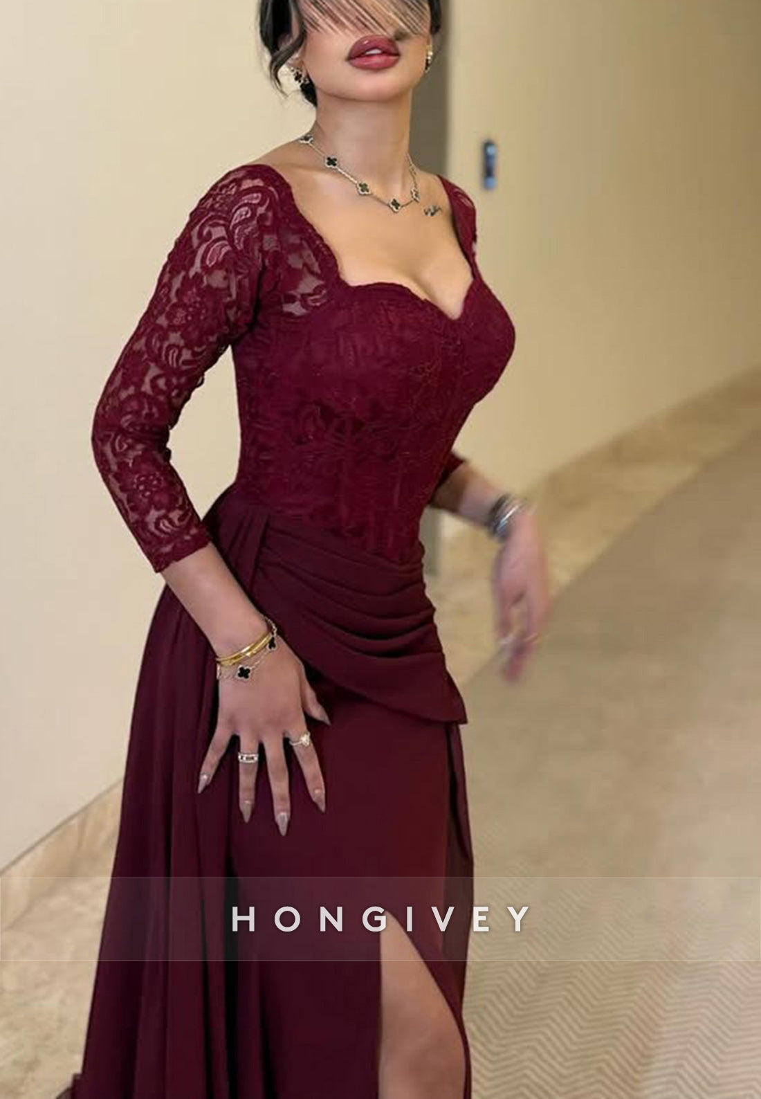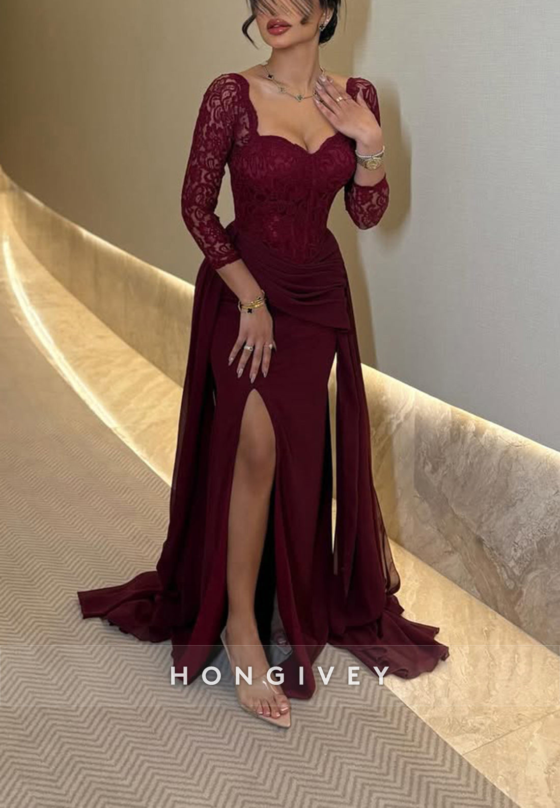 Lace 3/4 Sleeve Side Slit Sweep Train Column Formal Evening Dresses