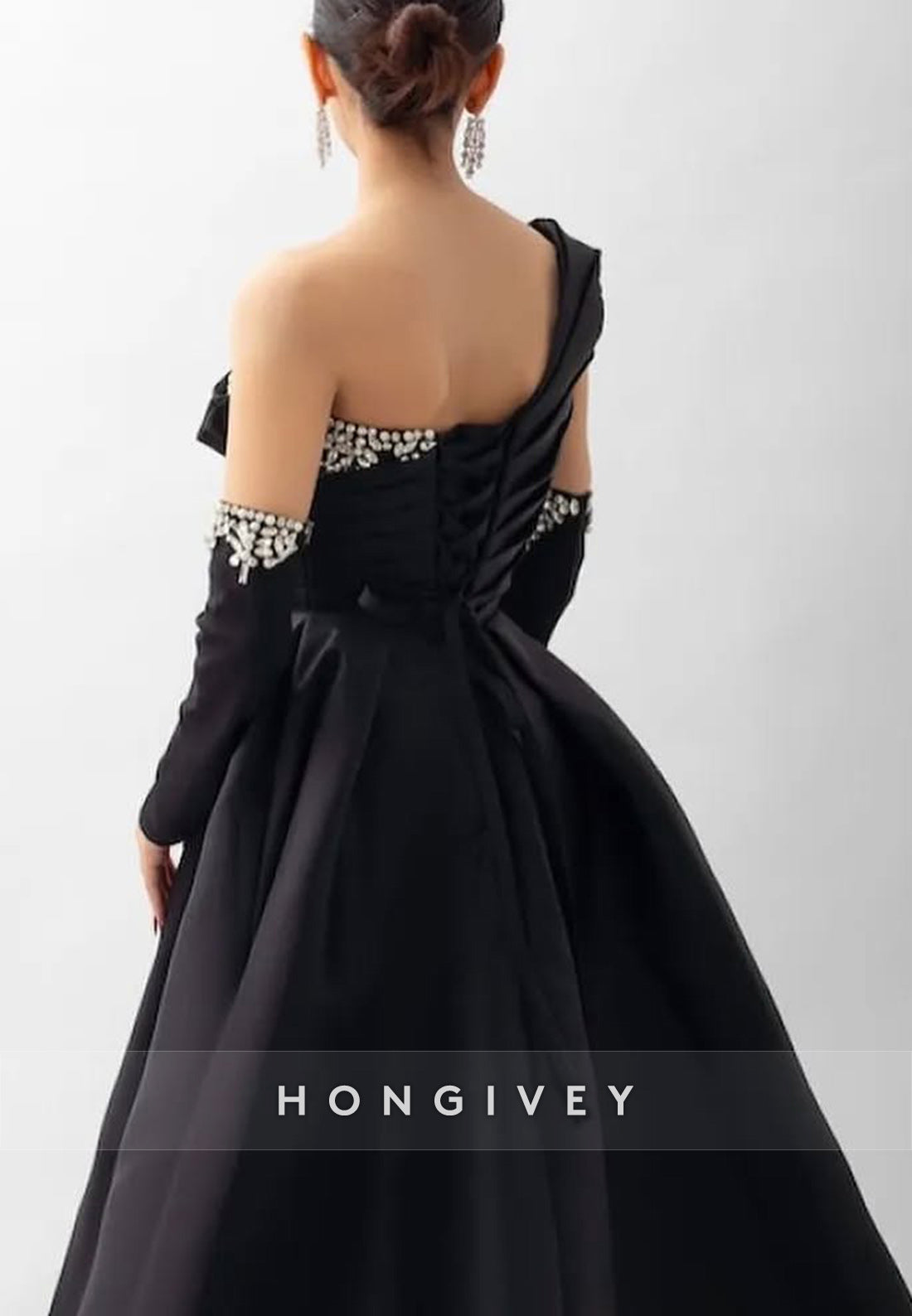 Black Ball Gown One Shoulder Beading Pleated Evening Formal Dresses