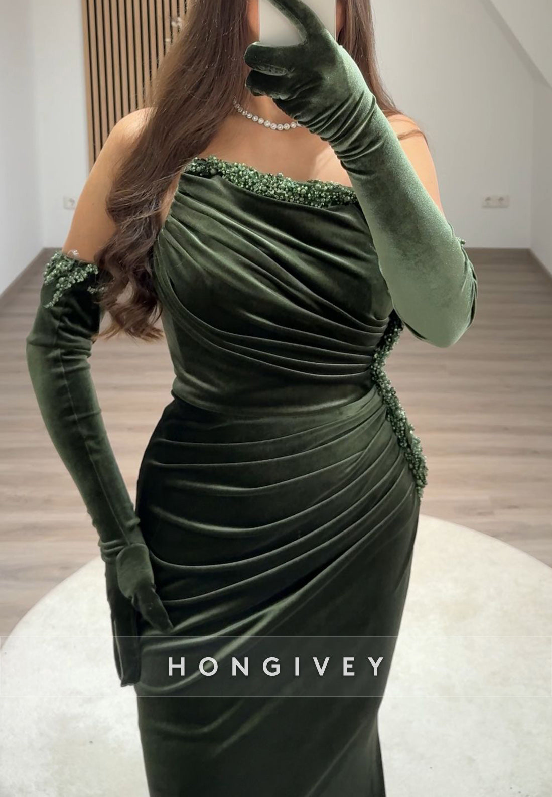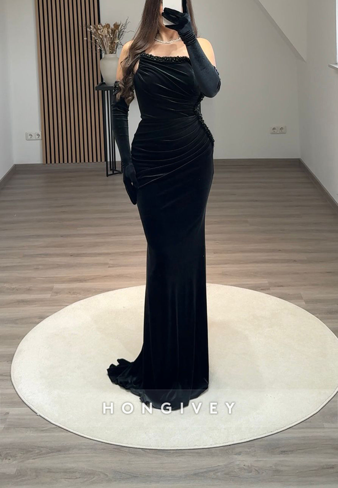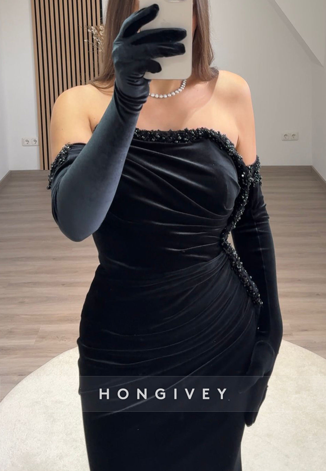 Column Off the Shoulder Pleated Floor-Length Beading Formal Evening Dresses