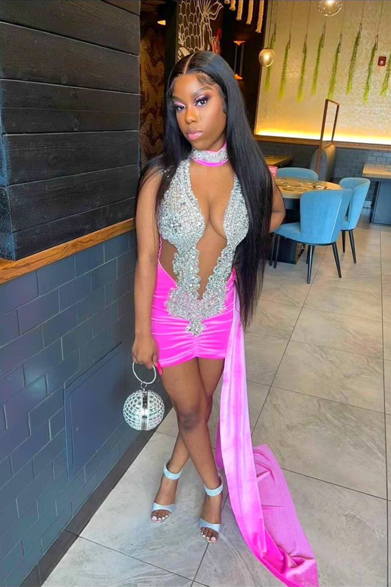 H5622 - High Neck Sequined Beaded Ruched Satin Sheath Mini Homecoming Dress