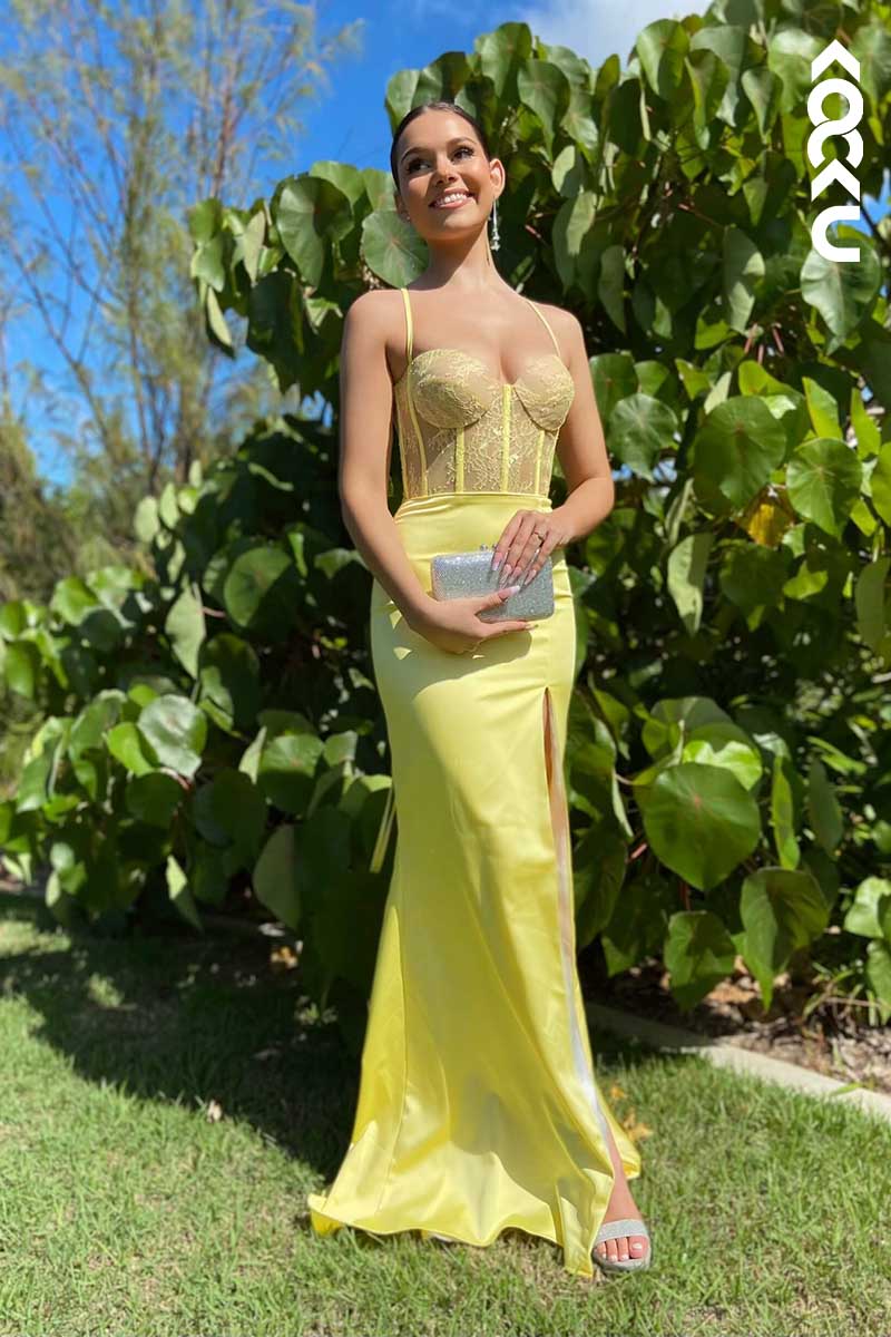 L1520 - Sweetheart Spaghetti Straps Lace Sheer Long Prom Dress With Slit