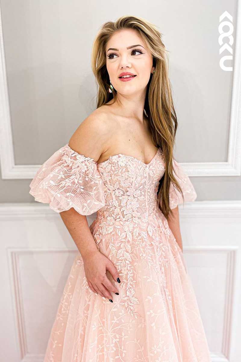 L1538 - Sweetheart Lace Appliqued A-Line Long Prom Dress With Puff Sleeves