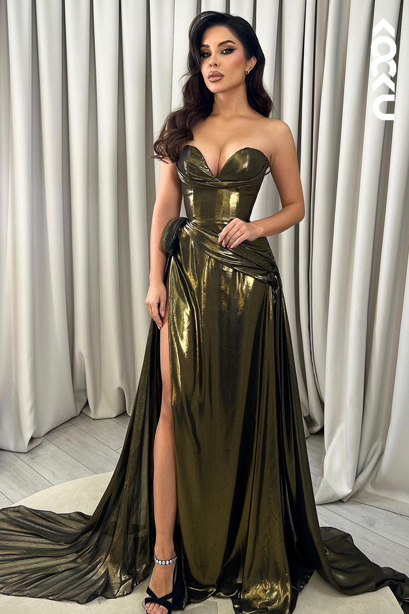 Details: | Sweetheart, Strapless, Sparkly, Ruched, A-Line, Long, Thigh Slit |