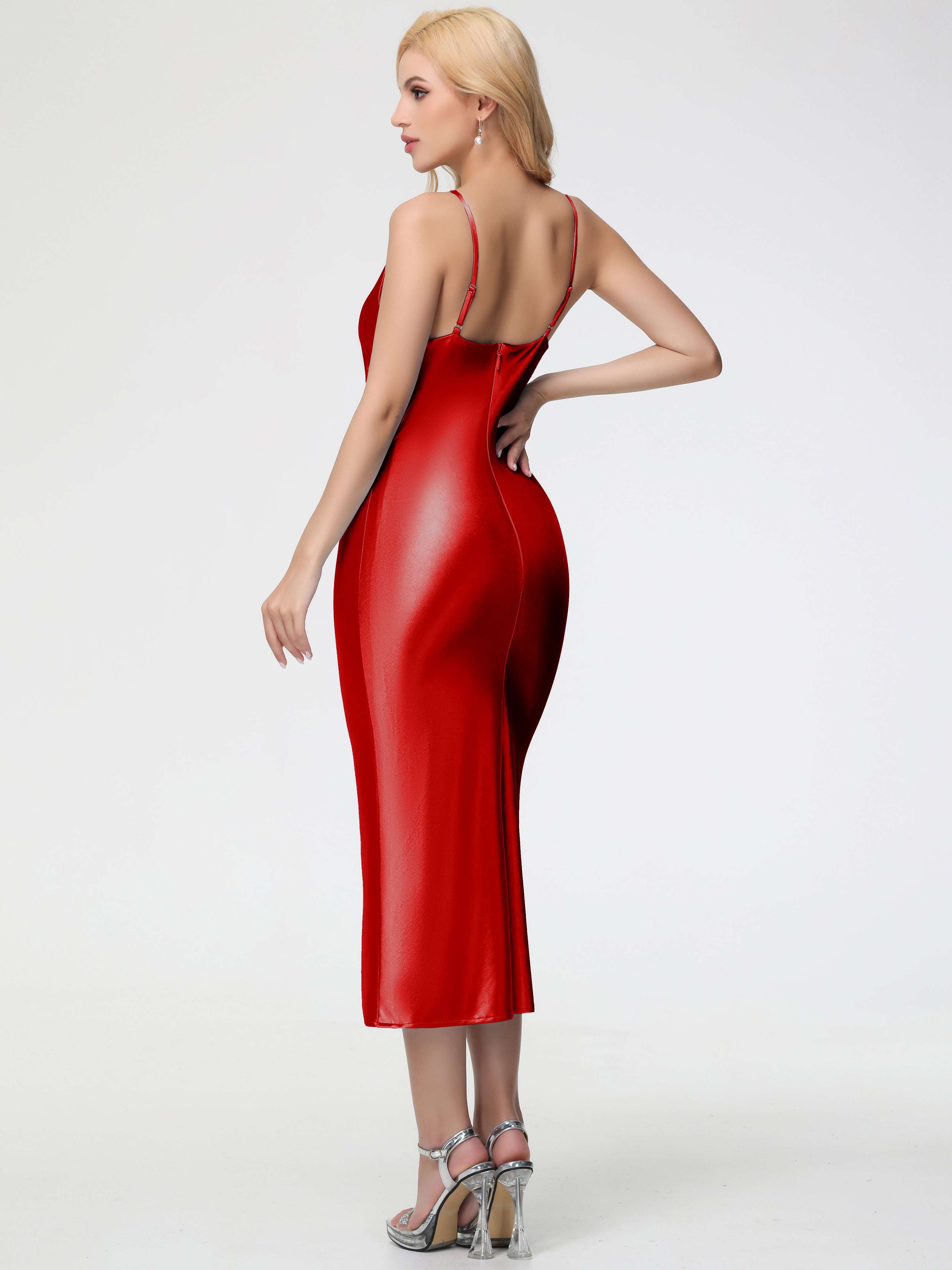 Red Formal Dresses Sheath/Column Straps Cowl Neck Tea Length Stretch Satin Formal Dress